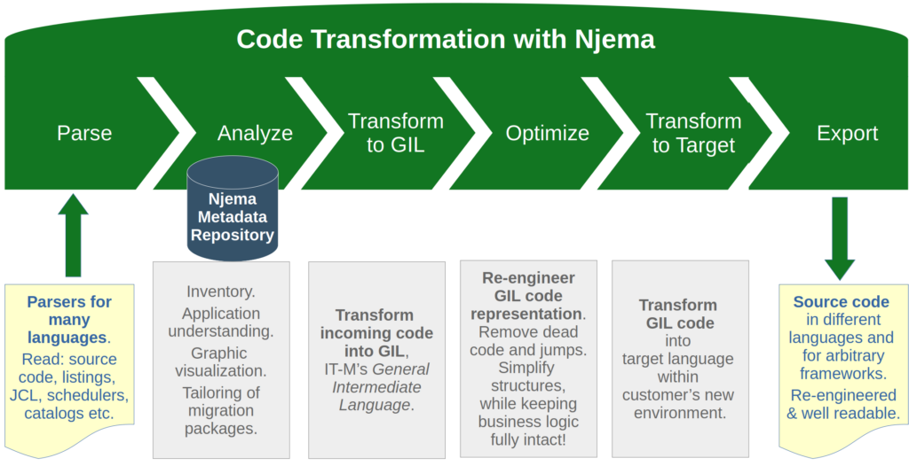 Njema enthält einen riesigen Fundus an Transformationsregeln. Nach der maschinellen Analyse setzt ITM aus bestehenden und projektspezifischen Regeln die benötigten Transformation Engines zusammen, die innerhalb von Minuten oder wenigen Stunden Millionen von Codezeilen automatisiert in neue Sprachen umsetzen, Programme an neue DB oder OLTP Systeme anpassen u.v.a.m. Mehr dazu …