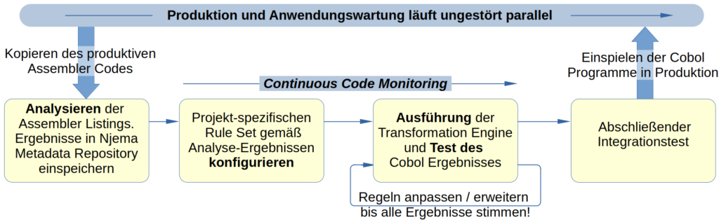 - ermöglicht es, innerhalb von wenigen Stunden eine vollständige Transformation und den finalen Integrationstest durchzuführen, bevor die Anwendung als Cobol-Inkarnation in Produktion gehen kann.